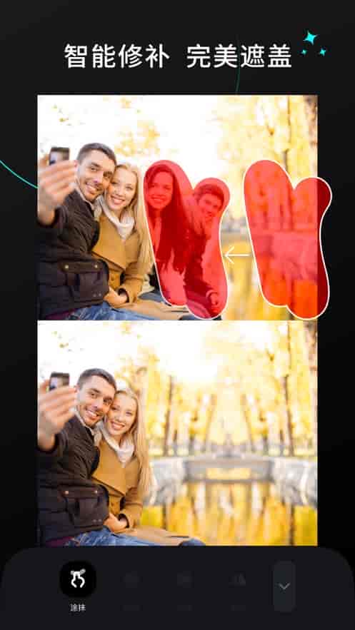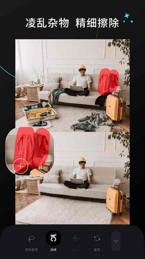 1、快速消除,使用涂抹標(biāo)記對(duì)象后用戶進(jìn)行自動(dòng)消除,使用恢復(fù)可在蒙版考上涂抹多余的部分,使其恢復(fù)到消除之前的狀態(tài)。