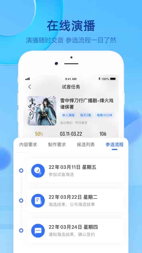 4、在線演播,演播隨時(shí)交音,參選流程一目了然。