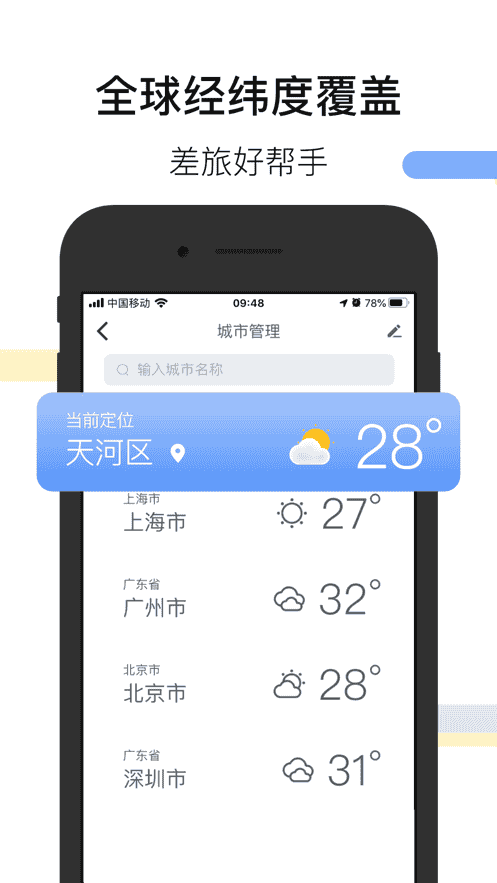1、我們覆蓋了全國三百多個城市及地區的詳細天氣數據。出門無憂,實實在在的天氣小助手。