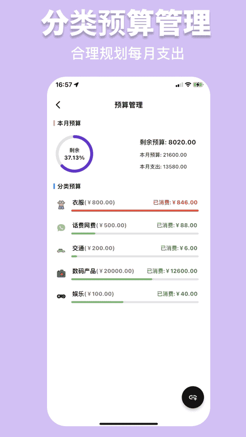 5、分類預算,支持設置總預算,讓花銷變的清晰明了。