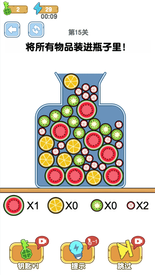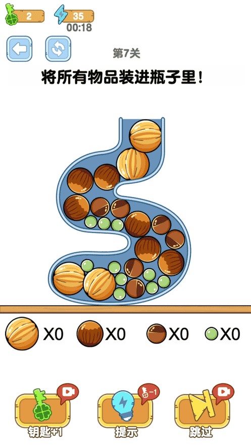 1、將游戲內給與的物品全部裝入瓶子內就可以完成關卡,超多趣味關卡的設計,豐富闖關的體驗。