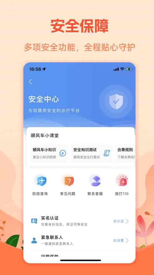 5、多種行程安全保障,緊急聯系人,一鍵報警,親友護航,保你出行無憂。