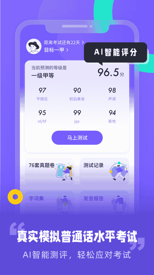 1、真實模擬普通話水平考試,AI智能測評,輕松應對考試。