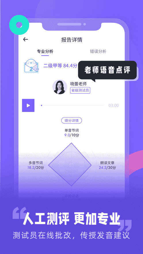 4、人工測評,更加專業,測試員在線批改,傳授發音建議。