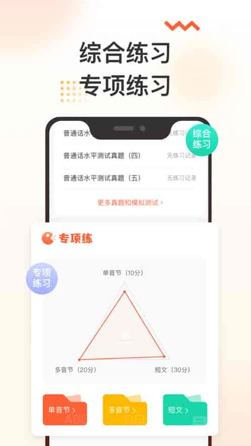 3、專(zhuān)項(xiàng)練習(xí),提供全面的聲母、韻母、聲調(diào)、單音節(jié)字、多音節(jié)詞、短文朗讀等練習(xí),薄弱環(huán)節(jié)針對(duì)性練習(xí),讓考試成績(jī)更優(yōu)。