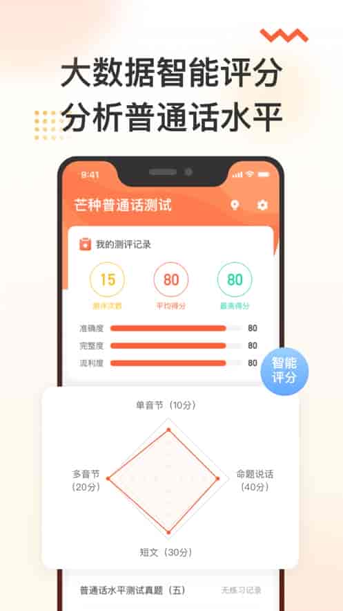 2、大數(shù)據(jù)智能評(píng)分,全面分析你的普通話(huà)水平。