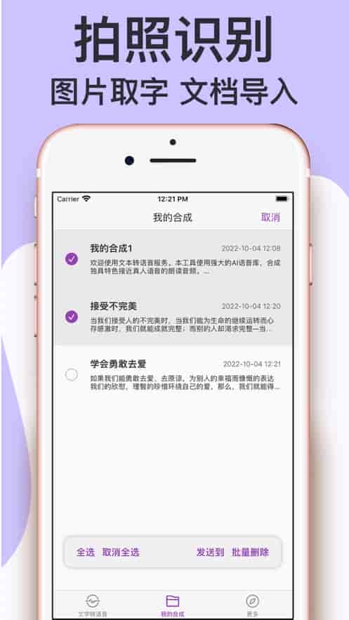 1、文字轉(zhuǎn)換語音適用智能語音合成,輸入文字秒轉(zhuǎn)語音,專業(yè)配音一鍵合成。