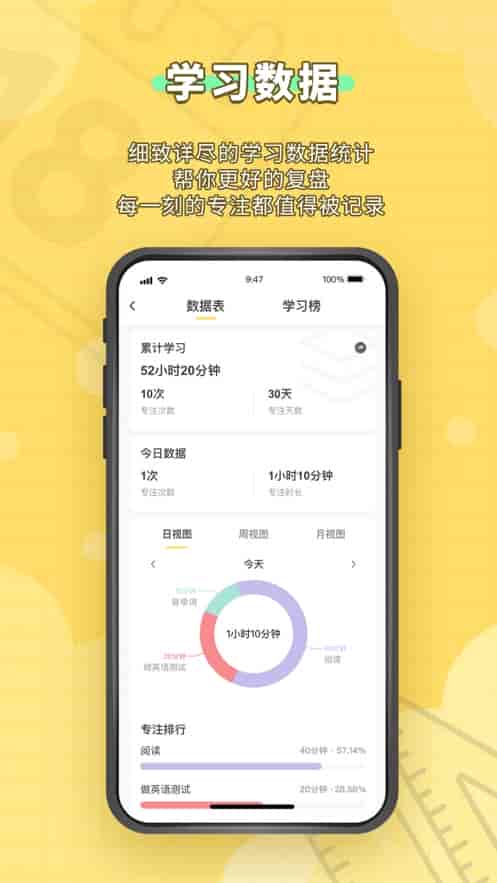 2、學習數據,細致詳盡的學習數據統計,幫你更好的復盤,每一刻的專注都值得被記錄。