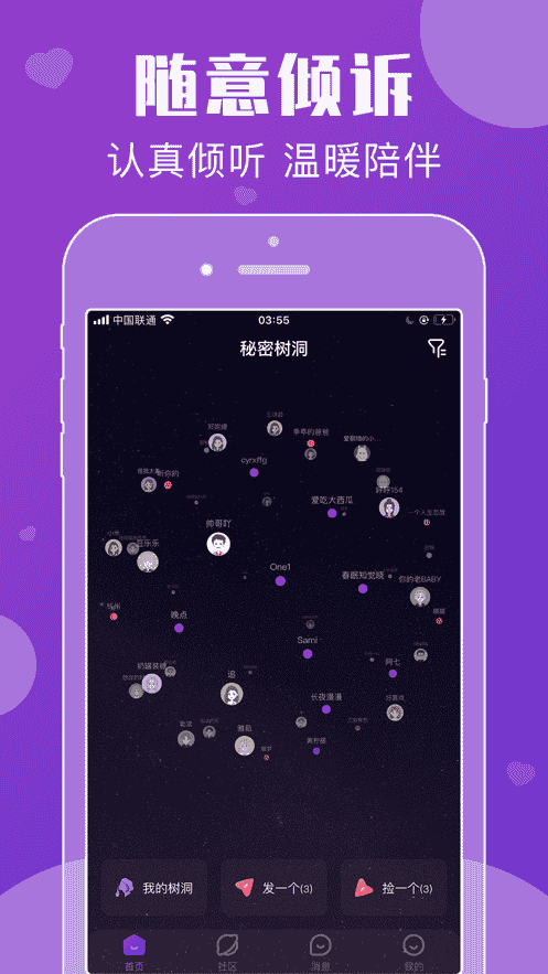 1、這款秘密樹洞,輕松幫你篩選到能懂你的另一半,在樹洞暢所欲言的同時總會有一份溫暖伴你左右。