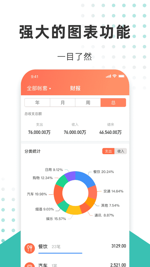 2、富有表現(xiàn)力的曲線圖、餅狀圖和收入支出排行榜,幫你快速分析消費(fèi)趨勢(shì)。