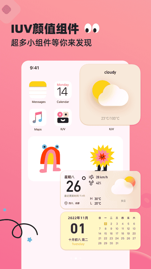 3、IUV個性化主題,一鍵打扮桌面。所有壁紙和小組件由專業(yè)設(shè)計(jì)師手工制作。