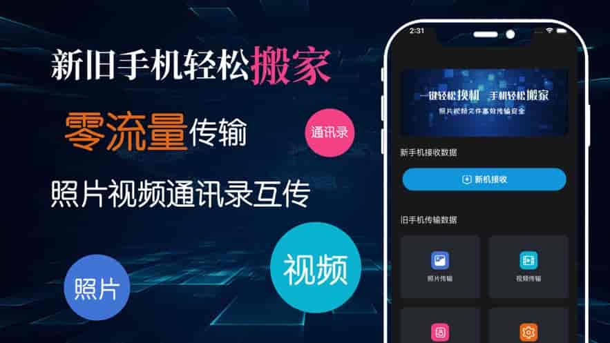 1、新舊手機移動方便,0流量傳輸,照片視頻通訊錄互傳。