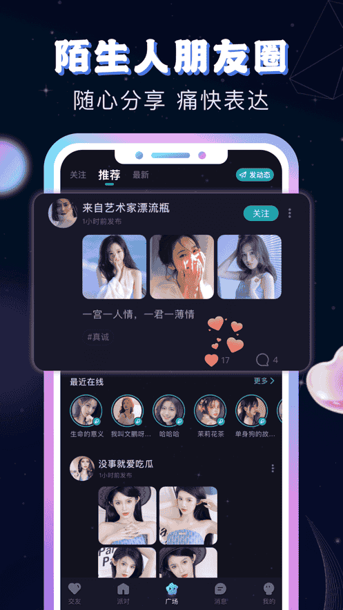 5、大量優質單身客戶可以隨時查詢附近人的動態,在這里分享日常生活,交新朋友,一起討論!