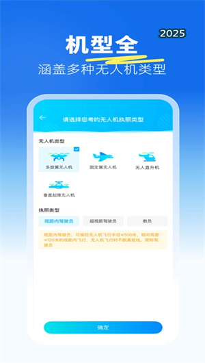 1.多機型與多執照等級覆蓋:軟件全面覆蓋多旋翼無人機、固定翼無人機、無人直升機、垂直起降無人機四大機型,以及視距內駕駛員、超視距駕駛員、教員三個執照等級。通過“機型切換”功能,學員可以根據自己的考試需求,選擇對應的學習內容。此外,軟件還提供“執照等級模擬測試”功能,學員可以針對不同等級進行專項練習,提升考試通過率。