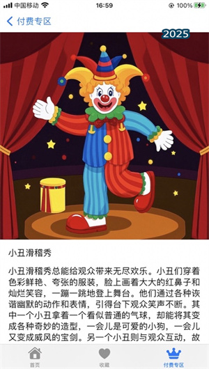 2.付費(fèi)專區(qū)與獨(dú)家內(nèi)容解鎖:軟件設(shè)有“付費(fèi)專區(qū)”,用戶可以通過購買會員或單次付費(fèi),解鎖獨(dú)家的小丑與馬戲內(nèi)容。例如,“小丑大師課”系列視頻由國際知名小丑藝術(shù)家錄制,涵蓋從基礎(chǔ)到高級的表演技巧。此外,付費(fèi)用戶還可以訪問“馬戲幕后花絮”,了解馬戲表演的幕后故事和制作過程。