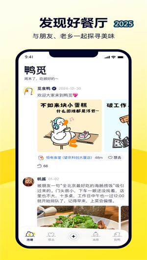 鴨覓App是一款專注于美食分享與社交的平臺,旨在為用戶提供一個發(fā)現(xiàn)美食、記錄生活、結(jié)交朋友的互動空間。通過鴨覓App,用戶可以輕松瀏覽朋友和老鄉(xiāng)的美食動態(tài),記錄自己的美食體驗,并在美食中發(fā)現(xiàn)生活的美好。無論是尋找附近的美食推薦,還是分享自己的烹飪心得,鴨覓App都能滿足您的需求。通過智能推薦、社交互動和個性化功能,鴨覓App將美食與生活緊密連接,為用戶帶來全新的美食社交體驗。