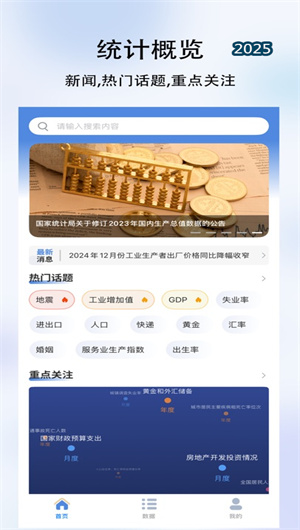 微統(tǒng)計(jì)App匯聚了國(guó)家統(tǒng)計(jì)局全面的統(tǒng)計(jì)數(shù)據(jù),涵蓋GDP、CPI、PPI、人口出生率、失業(yè)率等關(guān)鍵指標(biāo)。用戶可以通過(guò)分類檢索或關(guān)鍵詞搜索,快速找到所需數(shù)據(jù)。例如,用戶可以查詢“2023年全國(guó)居民消費(fèi)價(jià)格指數(shù)(CPI)變化趨勢(shì)”或“2022年高校畢業(yè)生就業(yè)率”。數(shù)據(jù)展示形式多樣,包括圖表、趨勢(shì)線和數(shù)據(jù)表格,幫助用戶直觀理解數(shù)據(jù)背后的含義。這種便捷高效的數(shù)據(jù)查詢與展示功能,讓用戶輕松掌握最新統(tǒng)計(jì)動(dòng)態(tài)。