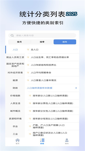 微統(tǒng)計(jì)App根據(jù)不同的維度和行業(yè),為用戶提供分類整理的統(tǒng)計(jì)數(shù)據(jù)。例如,用戶可以在“宏觀經(jīng)濟(jì)”分類下查看GDP、CPI、PPI等指標(biāo),或在“民生數(shù)據(jù)”分類下查詢居民收入、消費(fèi)價(jià)格、就業(yè)率等數(shù)據(jù)。每個(gè)分類都配有詳細(xì)的數(shù)據(jù)說(shuō)明和可視化圖表,幫助用戶快速理解數(shù)據(jù)含義。這種統(tǒng)計(jì)列表與分類整理功能,讓用戶輕松找到所需信息。