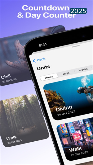 倒計時APP(Day Counter & Countdown App)是一款功能強大的天數計數器工具,旨在幫助用戶輕松記錄和追蹤過去與未來的重要事件。無論是慶祝過去的成就,還是期待未來的里程碑,倒計時APP都能滿足您的需求。通過自定義事件創建、智能通知提醒和事件分類管理,倒計時APP為用戶提供了一個簡潔直觀的操作界面,讓每一個重要時刻都觸手可及。告別繁瑣的多應用切換,倒計時APP將成為您生活中的得力助手。
