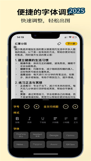 紅薯分圖APP內(nèi)置字體快速調(diào)整功能,用戶可以通過字體選擇工具和樣式調(diào)整系統(tǒng),快速調(diào)整圖片中的字體樣式和大小。通過字體優(yōu)化算法和樣式匹配工具,用戶可以輕松實(shí)現(xiàn)字體的個(gè)性化設(shè)置。無論是標(biāo)題字體,還是正文字體,紅薯分圖APP都能提供最靈活的調(diào)整支持。