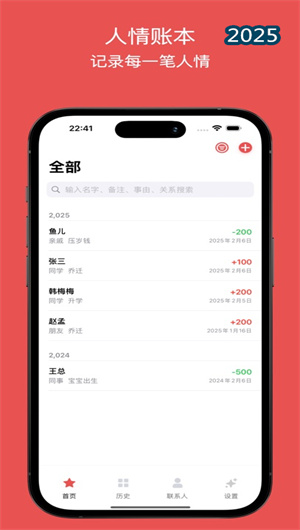 “人情賬本”是一款專業的禮金記賬工具,旨在幫助用戶輕松管理人情往來、紅包禮金、份子錢等,讓人情往來更清晰透明。無論是結婚、滿月、喬遷、壽宴還是其他喜事,都能通過“人情賬本”完美記錄。該應用結合了禮金記錄、多賬本管理、智能統計和數據安全等核心功能,通過智能提醒和數據分析,為用戶提供全方位的禮金管理支持。無論是家庭用戶還是職場人士,都可以通過“人情賬本”實現人情往來的精細化管理。