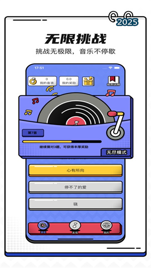 該游戲內置單人闖關模式,玩家需要通過逐步升級的關卡,測試自己的歌曲記憶能力。每一關都設計有不同的難度和歌曲類型,玩家需要連對多首歌才能進入下一關。這一功能特別適合喜歡挑戰自我的玩家,幫助其逐步提升音樂知識水平。