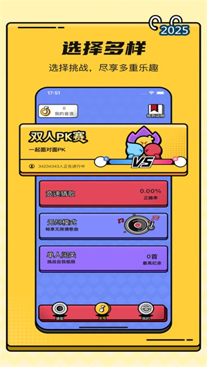 《音符猜猜》提供雙人PK模式,玩家可以與朋友一較高下,比拼誰能答對更多的歌曲。系統會實時顯示雙方的得分和進度,增加了游戲的互動性和競爭性。這一特色功能特別適合喜歡社交游戲的玩家,幫助其與朋友共享音樂猜歌的樂趣。