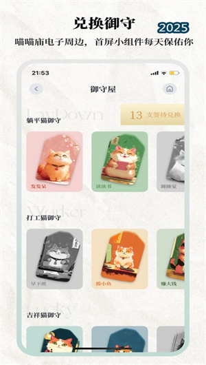 喵喵廟App提供精美設計的電子御守,用戶可以將御守設置為手機首屏小組件,每日接收來自喵喵神的好運祝福。通過獨特的數字化守護物,喵喵廟App為用戶提供日常的精神慰藉和守護。此外,App還支持御守個性化設置功能,用戶可以根據自己的喜好選擇不同的御守樣式和祝福內容,提升使用的個性化和趣味性。