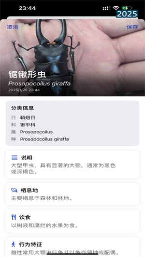 2. 識別后,軟件會提供昆蟲的詳細信息,包括其生物學分類(如鞘翅目、鱗翅目等)、生活習性(如食性、棲息地)以及地理分布(如熱帶、溫帶等)。