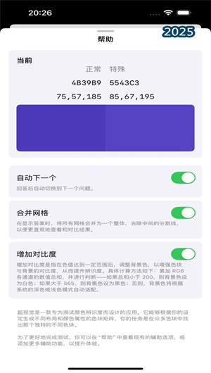 2. 輔助功能設置:為了更好地完成測試,超級視覺APP提供了多種輔助功能,用戶可以在“幫助”中查看現有的輔助選項,如高亮提示、放大鏡、色塊標記等。用戶還可以根據需要添加更多輔助功能,如聲音提示、振動反饋等,以提升測試體驗。這些輔助功能能夠幫助用戶更快速、更準確地找到獨特色塊,提高測試效率。
