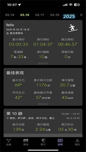 雪搭App的運動算法引擎實時記錄每次滑行的立刃角度、換刃頻率和重心位移等關鍵指標。3D動作重建技術可視化呈現滑行姿態,問題診斷系統指出技術短板,分析報告專業度獲教練4.8星評價。