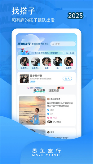 墨魚旅行打造了行程共創空間、興趣話題圈、旅行回憶墻三大社交場景。用戶可以在行程籌備期通過群組聊天、視頻面基、線下見面加深了解;在旅行過程中使用實時定位共享、費用AA記賬、回憶打卡等功能;在歸來后通過相冊共享、游記共創、評價互贈延續友誼。這種全周期的社交設計讓旅行關系更加持久穩固。