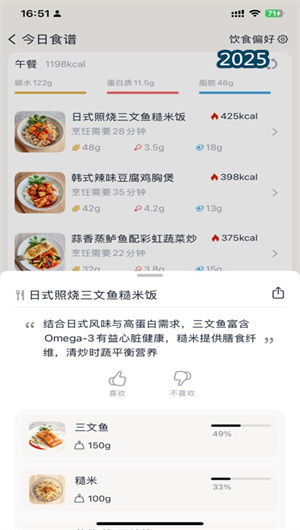 基于用戶健康畫像的動態(tài)營養(yǎng)算法,綜合考慮年齡、性別、活動量等20+參數(shù),生成周度智能餐單。場景化飲食建議覆蓋早餐能量補給、工作餐搭配、健身餐設(shè)計等不同需求,方案采納率高達89%。