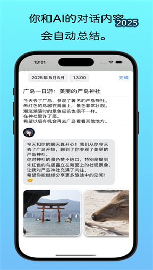 3. 多媒體整合:用戶可在日記中添加最多9張照片,AI圖像識(shí)別系統(tǒng)會(huì)自動(dòng)為照片生成詩意描述并插入文中合適位置。智能相冊功能按時(shí)間線整理所有日記圖片,支持人臉識(shí)別和場景分類檢索。特別開發(fā)的"記憶卡片"功能,將文字內(nèi)容和關(guān)聯(lián)圖片合成精美卡片,方便社交分享。