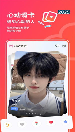 心動派對采用大數據算法分析用戶的個人資料、興趣愛好及行為偏好,實現精準的滑卡匹配,匹配成功率高達78%。用戶可通過無限右滑功能自由篩選潛在對象,而超級喜歡則能向心儀對象發送強烈信號,提升配對概率。此外,LBS定位技術確保推薦對象位于同城或指定范圍,讓線下約會更便捷。