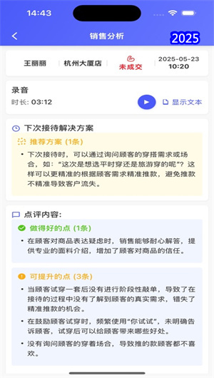 基于大數(shù)據(jù)的表現(xiàn)評(píng)估模型從親和力、專業(yè)度、說(shuō)服力等8個(gè)維度進(jìn)行評(píng)分,意圖識(shí)別算法準(zhǔn)確判斷客戶真實(shí)需求。平臺(tái)的弱點(diǎn)診斷系統(tǒng)會(huì)突出顯示需要重點(diǎn)改進(jìn)的環(huán)節(jié),進(jìn)步指數(shù)則量化展示每次訓(xùn)練的提升幅度,讓成長(zhǎng)清晰可見。