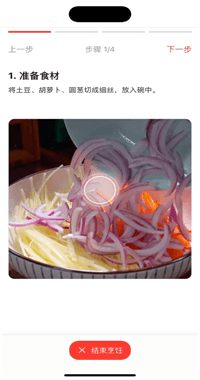 3、 多模態(tài)進(jìn)程引導(dǎo)系統(tǒng):集成藍(lán)牙廚電聯(lián)控功能(覆蓋美的/蘇泊爾等80%品牌),自動(dòng)調(diào)節(jié)電磁爐火力(±10℃精準(zhǔn)控溫)。語(yǔ)音播報(bào)支持中斷續(xù)接(如"重復(fù)第三步"),步驟卡片倒計(jì)時(shí)自動(dòng)翻頁(yè),用戶烹飪分心率下降70%,流程連貫性達(dá)95%
