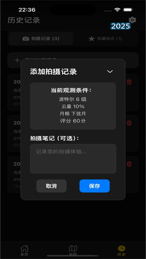 收藏夾功能可保存常用觀測點的坐標、光污染數據和訪問記錄。場地筆記系統允許添加文字描述和照片標記,建立專屬的觀星地點數據庫。離線地圖下載確保在沒有網絡信號的偏遠地區仍能查看關鍵位置信息。