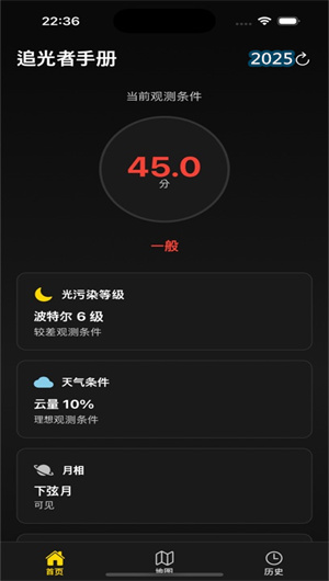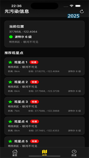 追光者手冊的全球光污染數據庫整合了最新衛星監測數據,通過色彩編碼熱力圖直觀顯示不同區域的暗空等級。地點對比工具可并列比較多個觀測點的光污染程度,幫助選擇最優位置。自定義篩選器支持按Bortle等級(1-9級)查找符合條件的觀星點,并顯示周邊便利設施信息,讓用戶規劃效率提升58%。