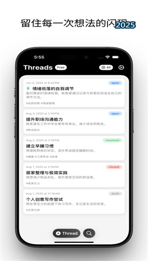 思線(Threadly)APP通過創(chuàng)新的時間線敘事方式和智能內(nèi)容關(guān)聯(lián)技術(shù),重新定義了個人記錄的意義。它將碎片化的生活點滴轉(zhuǎn)化為連貫的生命故事,讓用戶清晰看到事件因果、情緒流動和成長軌跡。無論是項目追蹤、事件梳理還是情感記錄,思線都提供了一種更自然、更有洞察力的方式。隨著持續(xù)的功能優(yōu)化和算法升級,思線將繼續(xù)引領(lǐng)個人知識管理的新范式,幫助每個人發(fā)現(xiàn)生活中隱藏的脈絡(luò)與意義。