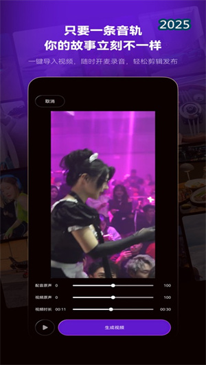 2. AI場景化配音與音畫智能匹配:該功能提供了豐富的場景配音庫,包含上百種情緒、語調和風格的聲音模板,如深情獨白、商務演講或派對狂歡背景音。用戶選中配音后,應用的音畫同步算法會自動分析視頻節奏和畫面切換點,智能調整配音的起伏與時長,實現完美契合。同時,支持AI語音克隆技術(需授權),用戶可生成與自己音色相似的配音,進一步強化內容的真實性與個人特色,讓每一條視頻的聽覺體驗都無比豐富。
