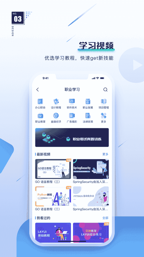 3、職業學習:辦公職場、設計教程、軟件技術、職業發展、目標管理、職業教育、金融經濟、攝影視頻、法律政策。