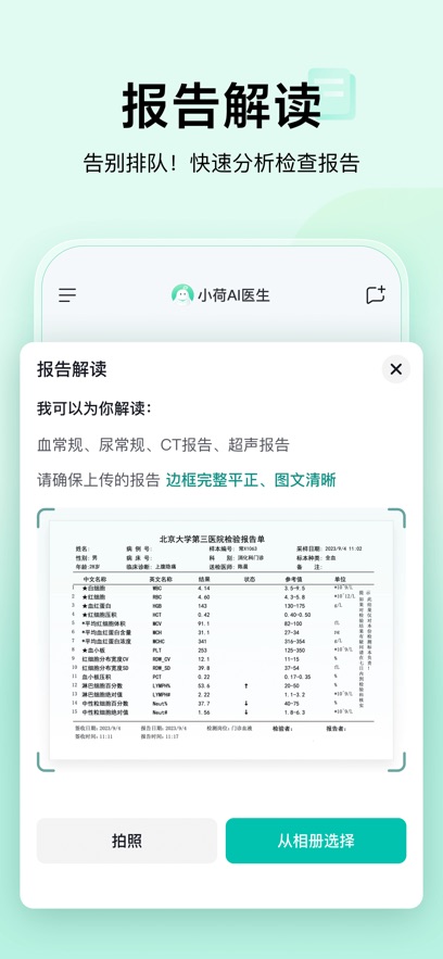2、多模態(tài)報(bào)告解讀:軟件支持包括血常規(guī)、影像學(xué)、心電圖在內(nèi)的多類檢查項(xiàng)目的智能化識別,上傳化驗(yàn)單即可解析千余項(xiàng)指標(biāo),并提供動(dòng)態(tài)健康圖譜。系統(tǒng)可直觀展示數(shù)據(jù)趨勢變化,對異常指標(biāo)進(jìn)行標(biāo)注,并生成就醫(yī)準(zhǔn)備清單,提升就診效率。