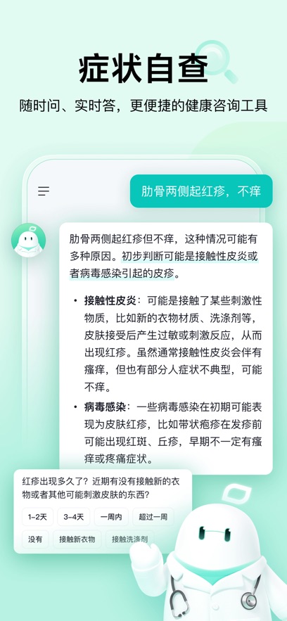 1、全科智能問診引擎:基于多輪追問算法,系統(tǒng)能在極短時(shí)間內(nèi)生成完整癥狀畫像,并輸出疾病可能性排序、用藥建議與急診指征等關(guān)鍵信息。診斷覆蓋范圍相比傳統(tǒng)自查工具擴(kuò)展數(shù)倍,極大減少了因信息缺失導(dǎo)致的誤判情況。