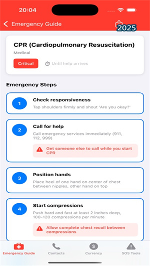 1. 離線急救指南功能內置醫療知識圖譜,涵蓋CPR心肺復蘇、燒傷處理、窒息急救、蛇咬傷處置、地震避險等20余類應急場景的詳細操作指引。系統采用步驟化呈現方式和高壓場景優化設計,通過可視化流程圖和語音提示功能指導用戶操作,支持多語言切換和字體放大顯示,確保在緊急情況下快速獲取準確信息。