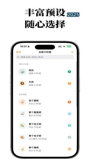 1. 平臺提供專業預設計時庫,內置溏心蛋計時方案、牛排熟度控制、意面煮制時間、蔬菜營養保留與烘焙溫度時間配比等標準化方案。每個預設都基于食材厚度計算、加熱方式分析與理想口感設定精心調校,用戶只需選擇食材類型和 desired doneness,系統自動計算最佳時間參數。