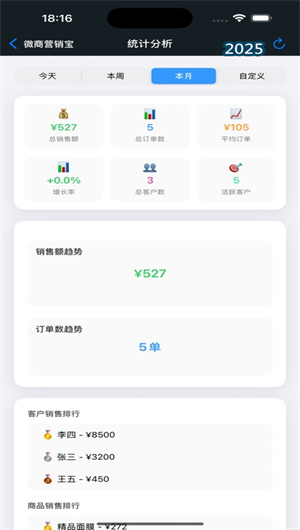3. 多維統計分析中心提供超過20種預設數據可視化模板,包括銷售趨勢曲線圖、客戶地域分布熱力圖和商品銷量排行柱狀圖等。系統通過數據挖掘引擎深入分析銷售數據背后的業務規律,生成每日經營簡報和周度業績對比報告,支持自定義指標看板讓用戶根據關注重點靈活配置顯示內容。高級分析模塊還提供** cohort分析(隊列分析)和銷售漏斗模型**,幫助微商識別業務瓶頸并優化運營策略。