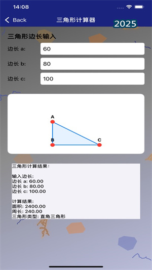 在三角形計算模塊中,用戶輸入三邊長度后,應用不僅能快速計算出周長和面積(使用精確的海倫公式),更能自動判斷三角形類型(如銳角三角形、直角三角形或鈍角三角形)。同時,應用會生成對應的準確幾何繪圖,并進行清晰的頂點標注。對于特殊三角形,如直角三角形,還會標注直角符號,這為理解三角形的幾何性質和進行證明提供了極大的便利。