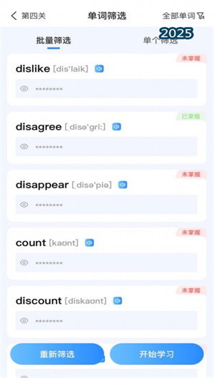軟件建立完善的學練測復四階學習模型,通過定向篩選精準定位未掌握單詞,采用專項訓練實現針對性強化。系統支持互譯游戲培養雙向記憶能力,結合認詞過關檢驗識別準確度,利用人機互動提升學習趣味性。借助聽說過關訓練聽力理解,配合拼寫過關鞏固拼寫記憶,確保每個單詞都經過多重維度的深度加工,形成牢固的記憶聯結。
