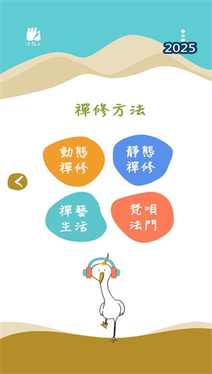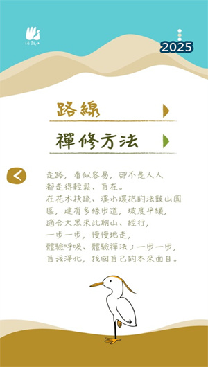 3. 自助禪修模式:不需預約、不設時間限制,用戶可依照自己的修行步調,隨時開啟一場身心對話。該模式提供從入門到精進的多層級禪修課程,包括止禪、觀禪與默照禪等實修體系,并支持離線下載。結合手機陀螺儀與加速度計,軟件能在行走間自動檢測身體姿態平衡,在分心時以輕柔鐘聲提醒回歸當下,實現真正的“隨開隨修”便利性。